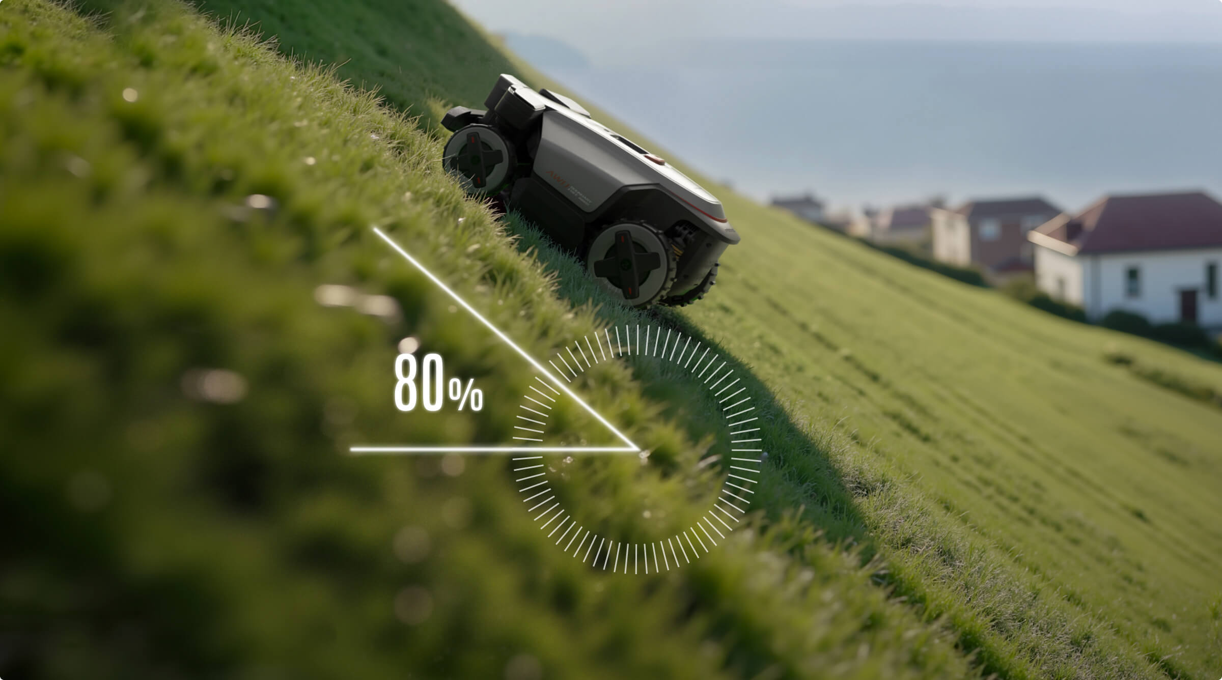 RockMow Z1 är utrustad med en avancerad fyrhjulsdrift och klarar utan problem branta sluttningar på upp till 38,7° (80 %)¹ och hinder på upp till 6 cm² – redo för nästan alla gräsmattor i bostadsområden. Den tar sig fram utan att fastna – från branta backar till ojämn terräng.