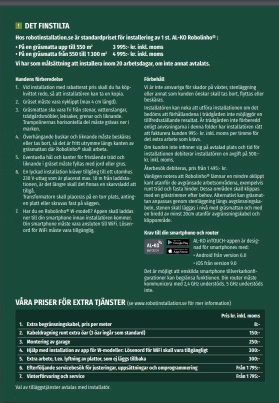 - För extra begränsningskabel utöver det som ingår i installationen tillkommer 8:-/m