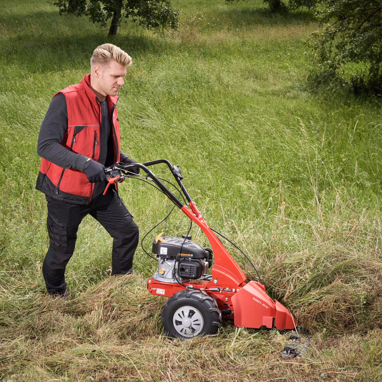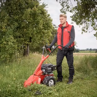 Slåtterbalken BM 5001-R IV arbetar effektivt och snabbt tack vare hög manövrerbarhet och en klippbredd på 102 cm. Den kraftfulla bensinmotorn med hjuldrift säkerställer enkel framkomlighet och tillförlitlig klippning, även i hög undervegetation, tät vild vegetation, terräng och i sluttningar. Det är här maskinen visar sin stora flexibilitet, vilket gör att den kan användas optimalt i nästan varje hörn av ängar och åkrar.