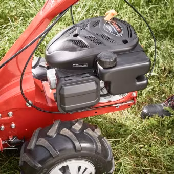Den kraftfulla 2,7 kW-motorn säkerställer ett snabbt och smidigt arbete. Den driver knivdrivningen, som kan kopplas in och ur, och hjuldrivningen, som också kan kopplas in och ur efter behov och har en framåt- och en backväxel. Med den individuella drivväxlingen visar gräsklipparen sin styrka även i ojämn terräng med sluttande kanter (t.ex. på ängssluttningar) och garanterar en särskilt hög säkerhetsnivå. Tillsammans med det höjdjusterbara, vibrationsdämpade styret för perfekt manövrering utan trötthet och de 13 tum stora däcken med grov profil är optimal hantering möjlig i nästan all terräng och är dessutom skonsam mot kroppen. Den flyttbara gräsavvisaren ser till att inget gräs lämnas kvar på marken.