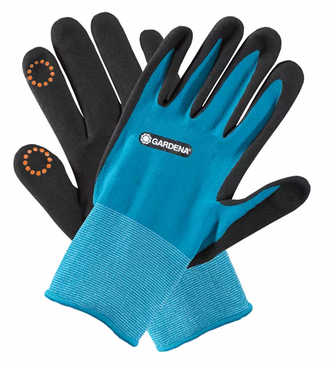 Planteringshandskar i storlek XL från GARDENA passar perfekt när du ska arbeta och gräva i blomsterrabatter. Tack vare nitrilbeläggningen förblir handflatorna torra när du arbetar med fuktig jord. Dessutom andas materialet på baksidan så att du inte svettas om händerna. Arbetshandsken med perfekt passform för extra stora händer imponerar med sin optimala form tack vare det flexibla materialet på manschetten och handryggen. Mobilpekfunktionen på tummen och pekfingret gör den än mer praktisk eftersom du kan använda en pekskärm på en smartphone eller surfplatta. Du behöver inte ta av den smartphonekompatibla och vattentåliga planteringshandsken. Handskarna är fria från skadliga ämnen för planterings- och jordarbete och har därför certifierats med Oeko-Tex® Standard 100.